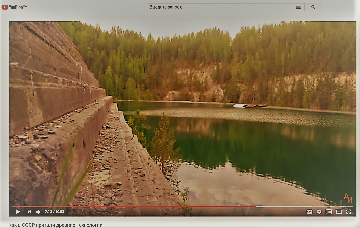 Ну а теперь привет из Сибири...Эх,жил там когда-то...Ну и ладно.Теперь скрин с сервиса Youtube и здесь я наблюдаю очень интересную картину - не помню,но это находится точно в Сибири,точное место и красиво очень-холмистый берег,заросший лесом,водная гладь и ещё второй берег-но этот берег не совсем берег,это просто лестница с огромными ступенями,которые уходят в воду,как я понял,и эти ступени слишком ровные для природного образования,эти ступени явно вырублены в скальном массиве и очень ровно так,но разные по высоте и ширине-видимо тренировался кто-то...Конечно это сделано не просто так,ничего просто так не делается,особенно в глухой тайге в скальном массиве...В Сибири вообще очень много интересного,хотя бы то что практически вся тайга поделена ровнейшими просеками на